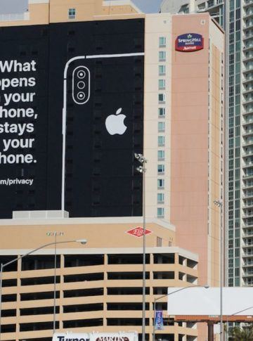No anúncio gigante colocado ao lado de um hotel Marriott vemos a frase: “O que acontece no seu iPhone, fica no seu iPhone”. Na parte inferior do cartaz, há uma URL apontando para as políticas de privacidade da Apple.