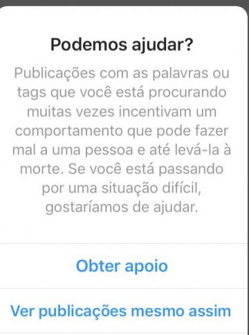 Ao digitar uma das duas palavras, a plataforma abre um aviso: “Publicações com as palavras ou tags que você está procurando muitas vezes incentivam um comportamento que pode fazer mal a uma pessoa e até levá-la à morte. Se você está passando por uma situação difícil, gostaríamos de ajudar”.