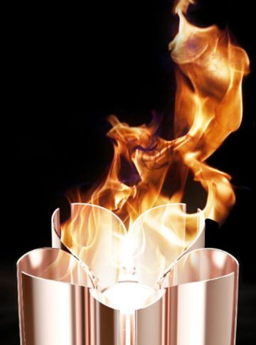 A parte superior da tocha foi criada usando a mesma tecnologia empregada para produzir trens-bala. Ela é totalmente revestida em ouro rosa e as cinco pétalas desenhadas na ponta fazem referência aos anéis olímpicos.