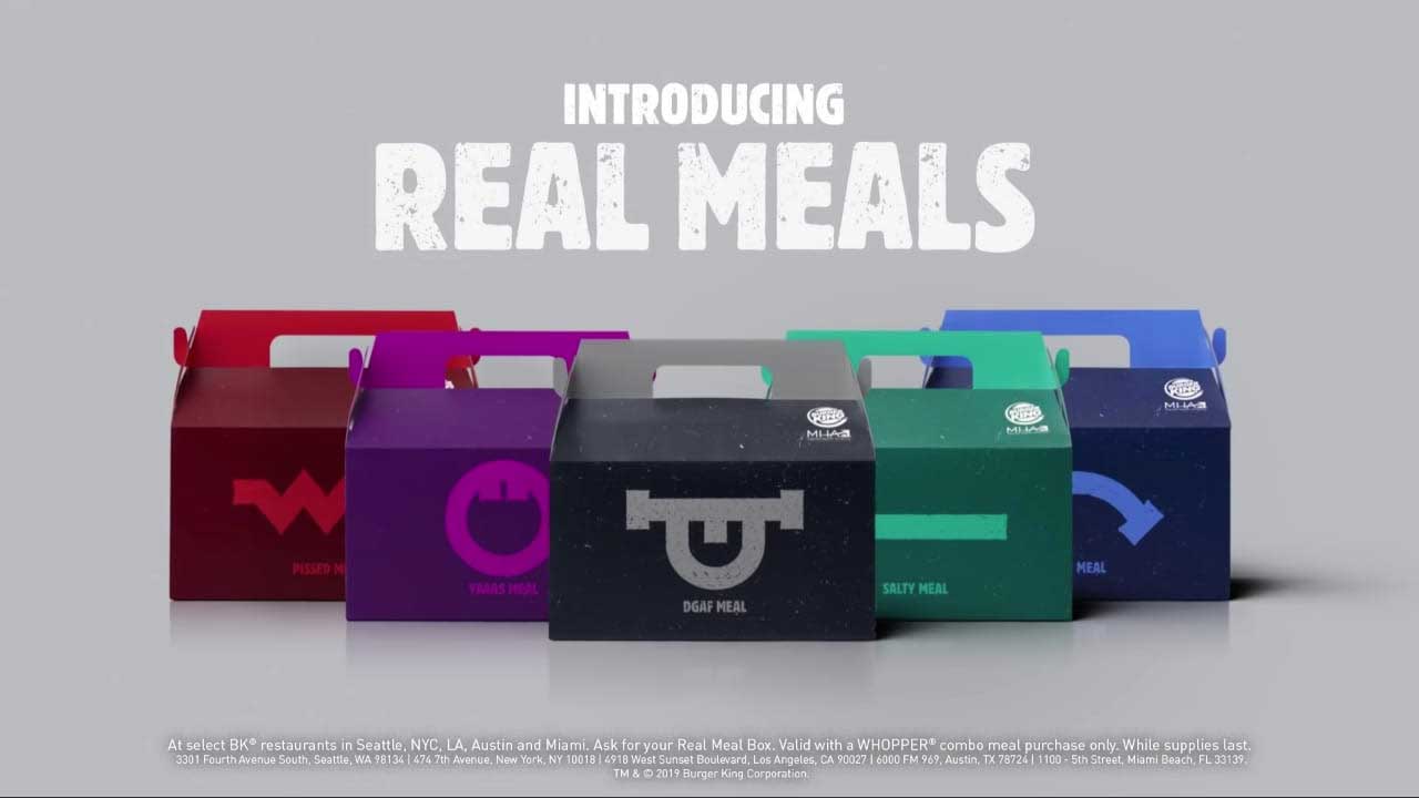 Os Real Meals virão em diferentes caixas, cada uma com uma cor e um desenho diferente. Cada uma das caixas trará um combo do Whooper (com refrigerante e batata frita) em tamanho normal, mas não virá com nenhum brinquedo. Os Real Meals também virão com palavras que representam os sentimentos dos consumidores, como “nervoso”, “triste” e alguns intraduzíveis, como “yaaaas”. A empresa ressalta o fato de não haver a opção “feliz” e ainda brincou com isso no anúncio: “Ninguém é feliz o tempo todo, e está tudo bem com isso”, fazendo referência ao “lanche feliz” do concorrente. A ideia é ressaltar as diferentes nuances emocionais que todos vivemos no dia a dia.