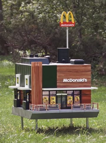 Isso porque em parceria com a agência Nord DDB a rede de fast food resolveu criar o McHive, o menor restaurante já visto da franquia que na real serve as abelhas. Réplica exata do atual modelo das unidades, a lanchonete na real é uma grande colmeia de apicultura para as abelhas, com placas inseridas dentro da caixinha desenvolvida para a ação. O Mc inclusive lançou um vídeo sobre o processo de concepção da colmeia de fast food, que você confere acima.