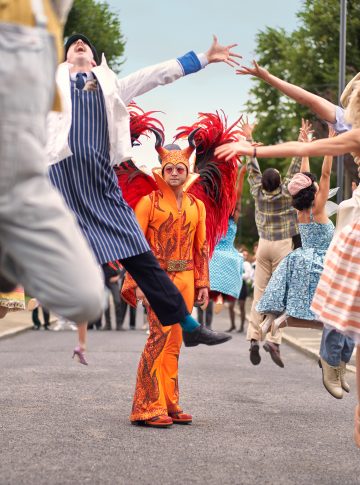 “Rocketman” consegue, portanto, estabelecer com calma e eficiência todos os conflitos da infância de seu protagonista, para que possamos, então, compreender como cada um deles reflete nos problemas enfrentados pelo artista ao longo da vida. Essas nuances emocionais da trajetória do personagem também refletem de forma como os musicais são construídos. Se as primeiras cenas musicais são dessaturadas e com poucos movimentos de câmera, aos poucos a dança, as cores e um estilo de filmagem mais frenético e picotado pela montagem tomam as rédeas da narrativa.