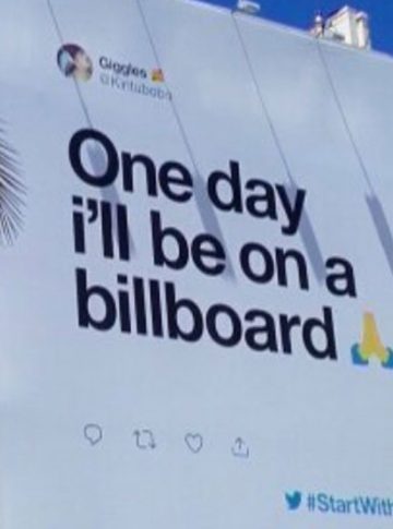 A rede social inaugurou na cidade a nova fase da campanha “#StartWithThem” com um outdoor que estampa um tweet onde se escreve “Um dia estarei em um outdoor”. Escrito pela usuária queniana @Kiritubobo no dia 30 de maio, a publicação é a primeira de uma série de ações da marca para contemplar a sua comunidade e as histórias que estes formaram dentro da plataforma, num jeito um tanto simpático da empresa demonstrar o quanto alterou a vida de várias pessoas na última década.