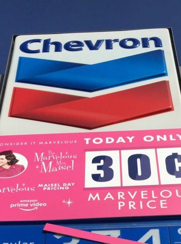 A Amazon tem encontrado jeitos no mínimo curiosos de promover sua série “Maravilhosa Sra. Maisel”, tentando sempre aproveitar o cenário do fim dos anos 50 da produção comandada por Amy Sherman-Palladino e Daniel Palladino para criar estandes e ações nostálgicas. A mais recente envolveu uma ideia que a princípio soa bonita em sua ingenuidade: a empresa resolveu vender o galão de gasolina pelo preço promocional de 30 centavos num posto da Chevron localizado na cidade de Santa Monica, Califórnia, como parte de um esforço nostálgico para dar uma impulsionada no valor midiático do seriado há um mês da realização da próxima cerimônia do Emmy – onde concorre em 20 categorias.