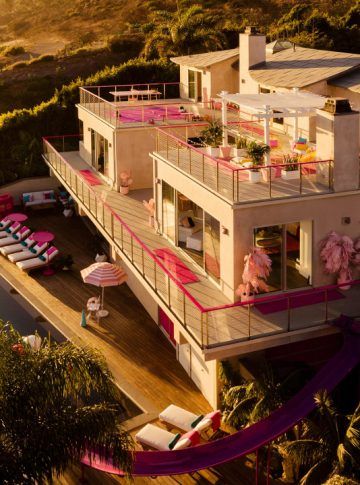 A Barbie’s Dreamhouse fica em Malibu, e apresenta uma decoração que imita a famosa casa de plástico que é icônica na infância de muita criança – incluindo até o escorregador que vai da varanda até a piscina, além de uma vista panorâmica (e real) do oceano.
