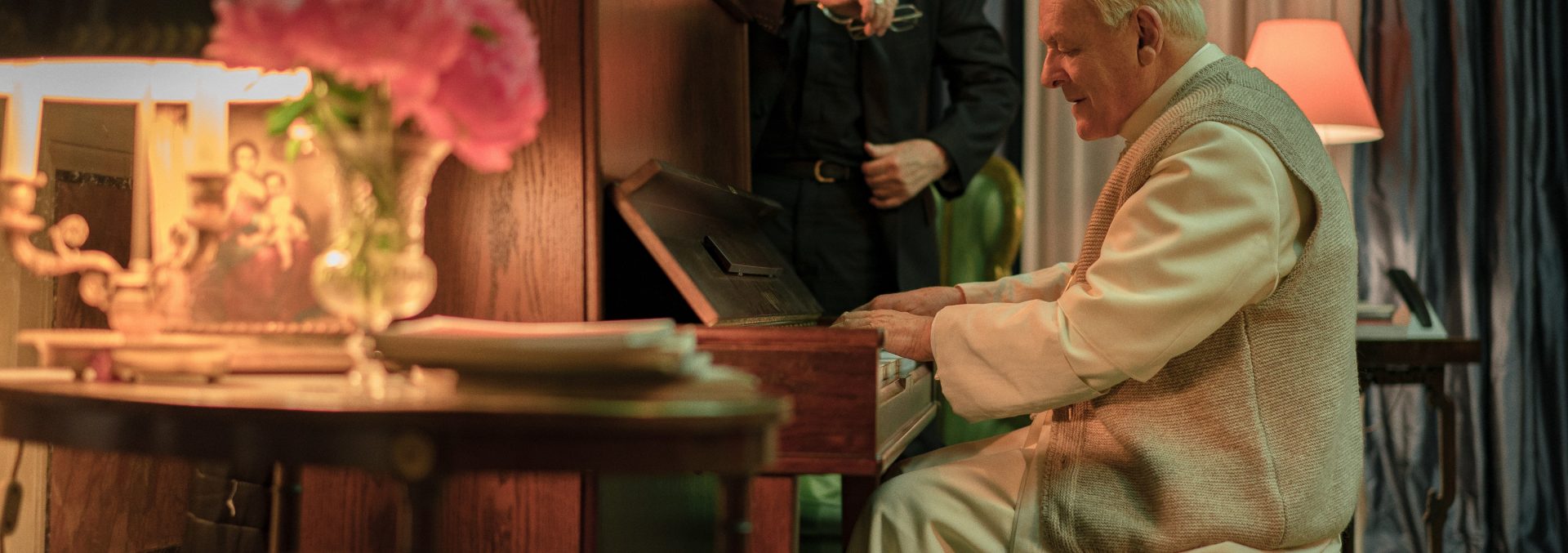 Mas se a produção é toda construída em cima do ato de complexificar o debate essencialista de McCarten, é óbvio que os arcos dos protagonistas miram uma jornada que busca encontrar as virtuais representações opostas a suas imagens atuais na mídia. Enquanto a Bergoglio cabe o maior espaço narrativo para de fato submetê-lo a esta purgação de pecados, mostrando seu papel dúbio e problemático na Argentina da ditadura militar, com Ratzinger o jogo desempenhado com o espectador é de encontrar humanidade num religioso tantas vezes condenado por posturas conservadoras, de ver ali entre o gosto refinado por música e uma alimentação da elite o homem estudioso e preocupado com a preservação de valores. O que une os dois homens, no fundo, é exatamente este olhar de interesse pelos caminhos da instituição que representam, afinal.