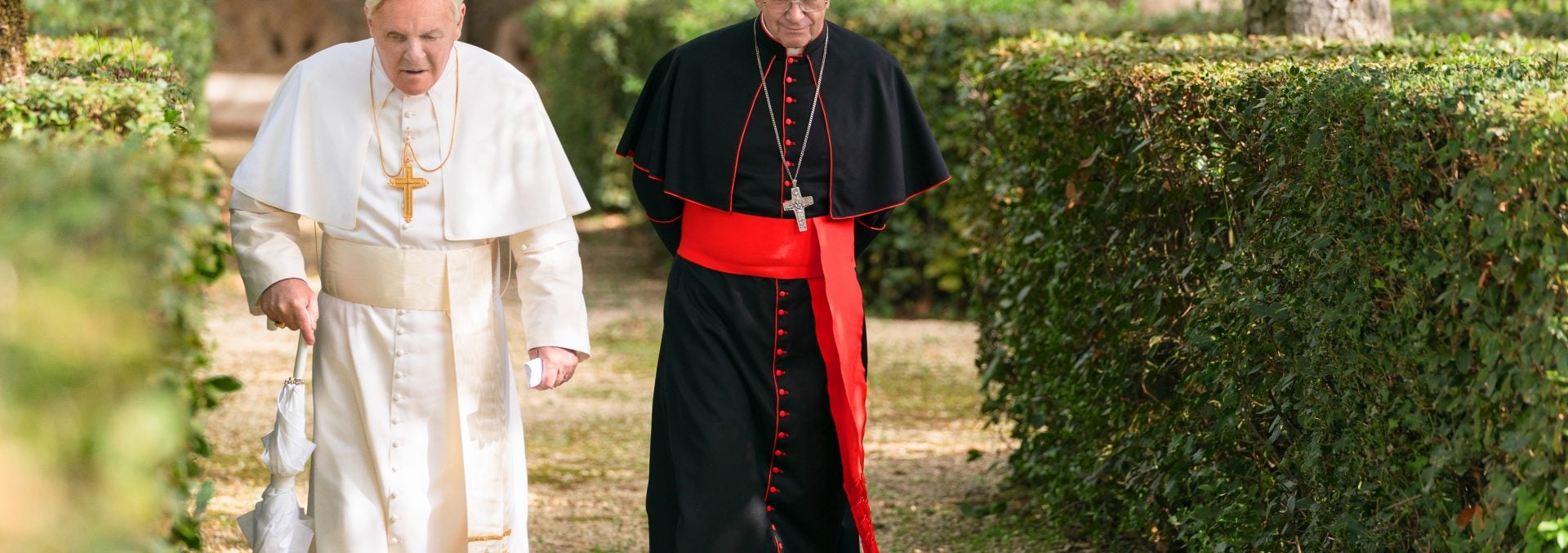 Neste sentido, a grande qualidade do filme dirigido por Fernando Meirelles é que ele abraça o discurso narrativo do projeto por sua tendência mais universal e de valores. Estruturado em torno de um curto encontro entre o futuro Francisco (Jonathan Pryce) e o então Bento XVI (Anthony Hopkins) meses antes do último abdicar do cargo, o roteiro de Anthony McCarten imagina grande parte das conversas entre os dois religiosos como embates sutis sobre a posição da Igreja Católica no mundo contemporâneo e a própria concepção de fé perpetuada pela organização nestes tempos, mas o longa muitas vezes parece escapar pelas beiradas para algo mais essencialista. Se a Igreja precisa evoluir isso se dará pelas vias da concessão ou da mudança, e é torno desta argumentação mais filosófica que a produção se pauta.