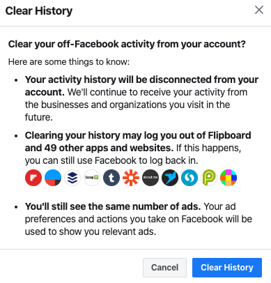 Anunciado em 2018, a função atua no sentido de permitir ao indivíduo que regule seu histórico na rede social da forma que melhor preferir e será disponibilizado a aproximadamente 2 bilhões de usuários nas próximas semanas, de acordo com o próprio Facebook na divulgação no blog oficial. De acordo com Mark Zuckerberg, o público agora poderá “ver um sumário das informações” que forneceram a cada aplicativo presente na plataforma “e limpá-la da conta se ela preferir”, definindo a novidade como “um novo nível de transparência e controle”.