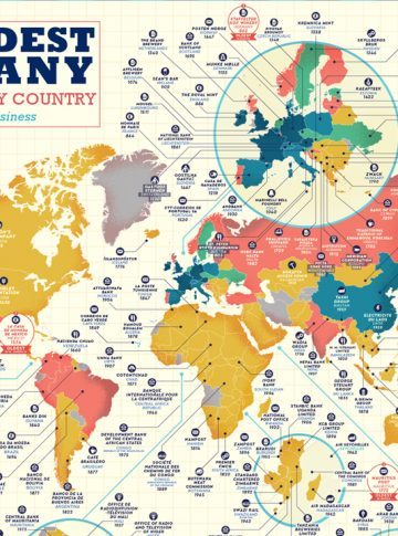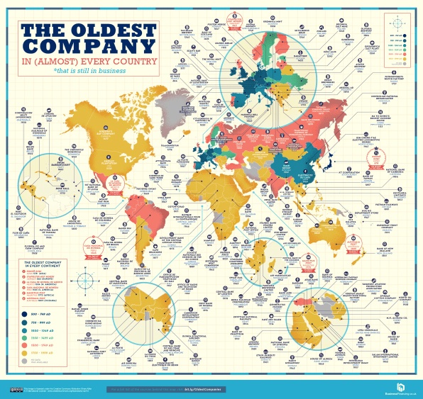 O interessante do mapa é ver como a história vem mudando os mercados ao ponto de, hoje, a maioria das empresas não chegar a duas décadas de existência antes de encerrar suas atividades. Segundo o mapa, a empresa mais antiga em atividade do mundo fica no Japão: a construtora Kongo Gumi, que foi fundada no ano de 578 e é especializada na construção de templos há incríveis 14 séculos. Segundo o Fast Company, a empresa foi comprada por um conglomerado do ramo de construção, mas a construção de templos ainda representa 80% de seu negócio.