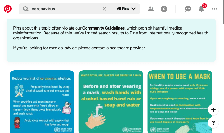 Ao pesquisar por “coronavírus” ou “COVID-19” no Pinterest, o usuário é levado para uma página que seleciona conteúdos da OMS sobre como proteger a si e aos outros, como lavar as mãos corretamente, quando usar máscaras, entre outras informações.