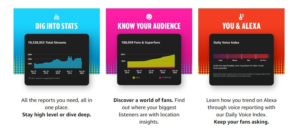 No mais, os recursos do Amazon Music for Artists são bastante similares ao Spotify for Artists, como a oferta de insights com base em dados de localização, contagens de streams em tempo real, que tipos de ouvintes mais escutam os artistas e em quais playlists e estações as faixas estão mais presentes. As informações incluem coleta de dados até o início de 2018 e são atualizadas de hora em hora.