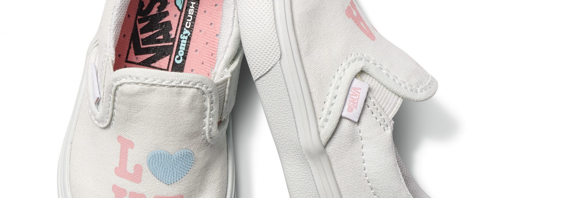 O ComfyCush Slip-On, exclusivo para bebês, transmite a mensagem de amor no pé direito “LOVE” e “VANS” no pé esquerdo, finalizado com um coração azul de textura suave em apoio ao Transtorno do Espectro Autista.