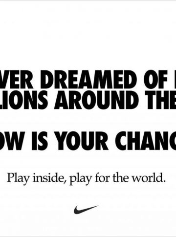Agora, foi a vez de a Nike lançar uma nova campanha incentivando a quarentena. “Se você já sonhou em jogar para milhões pelo mundo, agora é a sua chance. Jogue dentro, jogue pelo mundo” diz o texto, que incentiva as pessoas a praticarem quaisquer atividades físicas apenas dentro de suas casas, a fim de não serem infectadas pelo novo coronavírus.