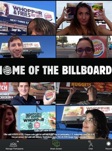 Não é mistério pra ninguém que o mundo esteja de ponta cabeça perante a pandemia do coronavírus, e num momento tão estranho a publicidade busca trabalhar com as ferramentas que tem. O Burger King, por exemplo, decidiu criar uma nova campanha que aproveita sua verdadeira população de outdoors nos EUA para o meio digital – mais exatamente as videoconferências do app do momento, o Zoom.
