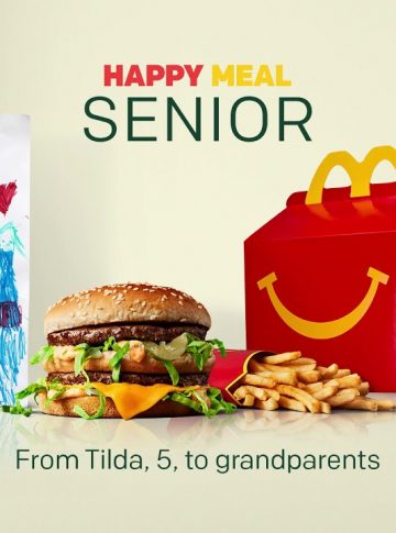 Sendo assim, para recompensar os avós por seu carinho, a rede no país criou o “Happy Meal Senior”, uma versão personalizada do McLanche Feliz que é entregue aos idosos que estão em casa. O brinde surpresa traz um desenho ou cartinha dos netos.
