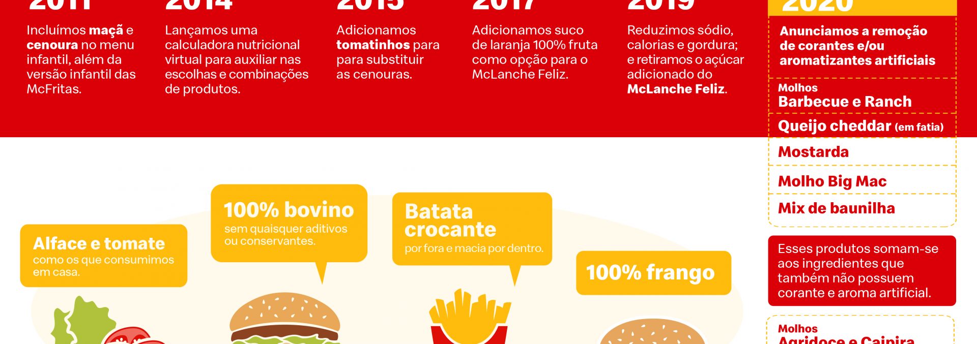 Ao longo dos últimos anos, a empresa trabalhou em conjunto com mais de 90 de seus fornecedores em toda América Latina e Caribe, sendo 15 no Brasil, para retirar aromatizantes artificiais de ingredientes como Mix de Baunilha, Molho Big Mac, Molho Ranch e Mostarda, além da remoção de corantes e aromatizantes artificiais do Queijo Cheddar (em fatia) e do Molho Barbecue. As mudanças afetam diretamente produtos como Big Mac, Cheeseburger e Quarterão, cujos pães já não possuíam nenhum destes aditivos artificiais, assim como o Molho Agridoce, Molho Caipira, Ketchup, Picles e Chicken McNuggets.