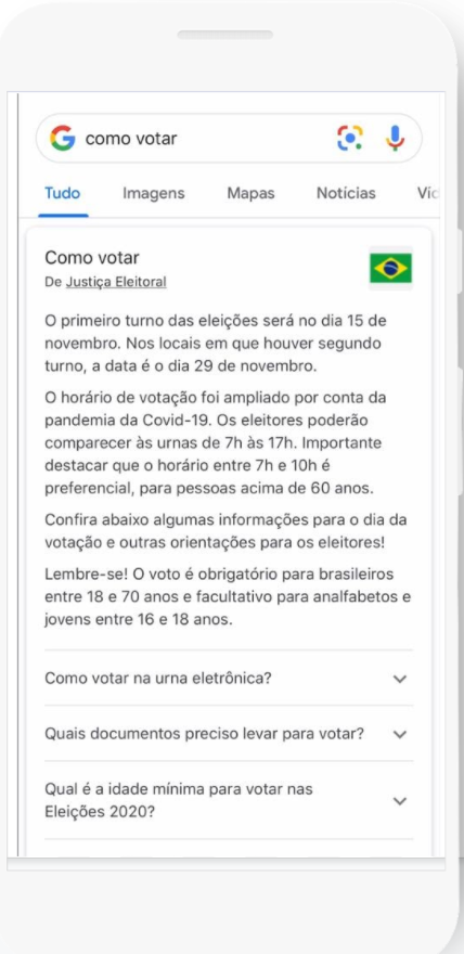 Quando o indivíduo pesquisar “Como votar” na Busca, aparecerá um painel com informações oficiais fornecidas pelo TSE indicando, por exemplo, quais documentos são necessários, como usar a urna eletrônica, qual a ordem de candidatos para votar e qual o horário da votação. Neste momento de pandemia, também terão destaque os cuidados sanitários indicados pelo Tribunal para os dias de votação para que o eleitor compareça à sua seção eleitoral e vote com segurança.