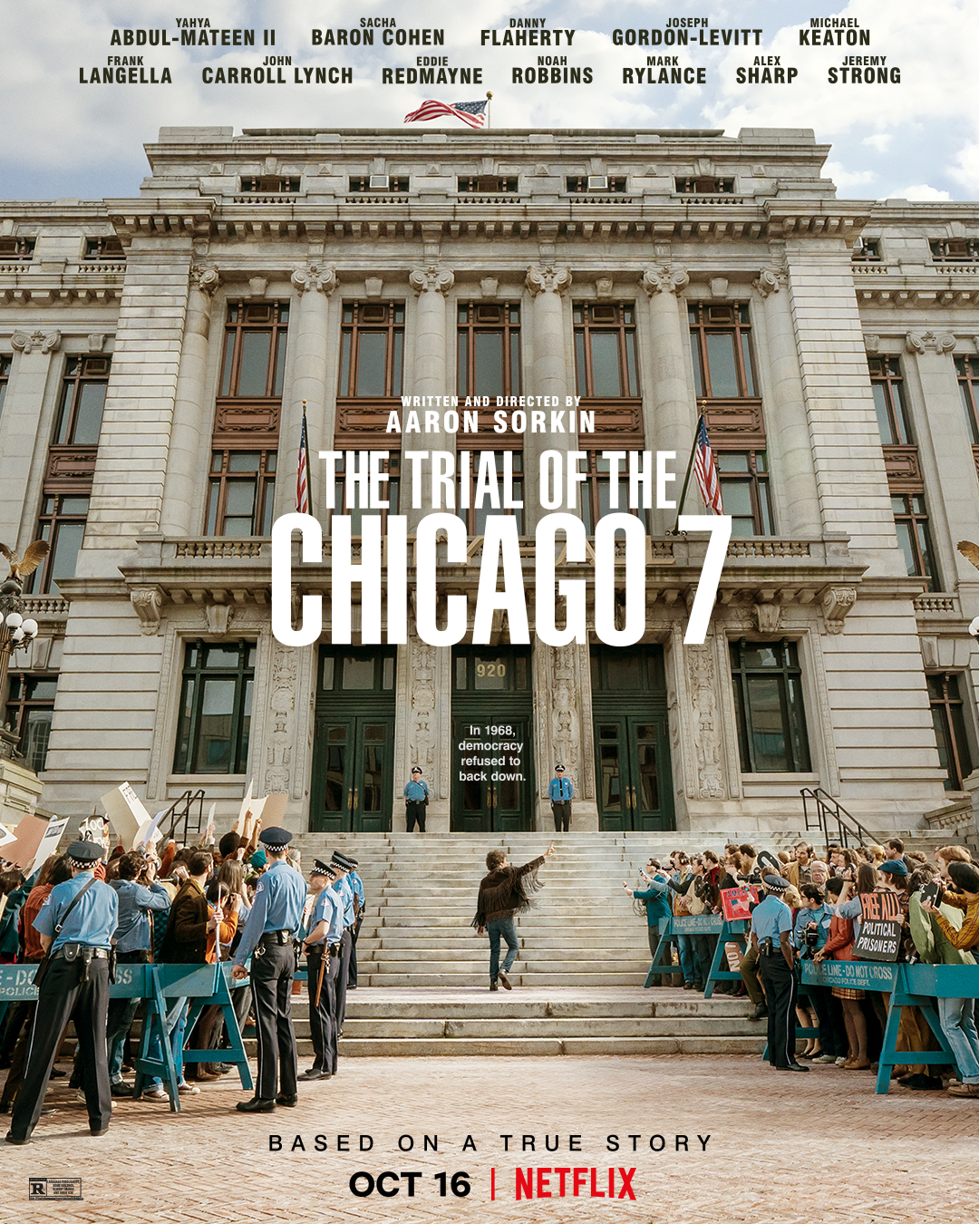 O diretor, afinal, é o artista cuja visão de mundo reflete no filme, e Sorkin, assim como Kaufman, ainda parece longe de ter o preparo para imprimir qualquer olhar para as histórias que conta. Seu novo filme, “Os 7 de Chicago”, é a prova disso. O filme se debruça sobre a clássica estrutura de trama de tribunal, acompanhando o julgamento e alternando as audiências do processo com flashbacks que reconstroem os acontecimentos prévios. Durante esse processo, Sorkin tenta analisar as tensões políticas e raciais e como elas norteiam não só as ideologias dos personagens, mas também o sistema jurídico.