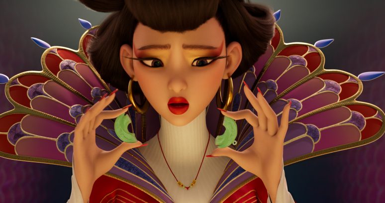 É verdade que Guo Pei já havia trabalhado no cinema antes – ela foi responsável por todas as vestes de dois blockbusters chineses com pé no fantástico, “A Lenda do Rei Macaco: Tumulto no Reino Celestial” e o recente “Contos do Caçador de Sombras” – mas sua atuação na animação da Netflix, ainda que limitada a única personagem, é tão ou mais complexo que qualquer outro projeto que ela tocou na área. A estilista colaborou de maneira bastante próxima a Glen Keane e sua equipe no processo de conceber os figurinos de Chang’e, com ela não apenas desenhando peças e trazendo padrões como orientando as formas pelas quais aqueles tecidos deveriam ser “costurados” digitalmente – algo que levava em conta até mesmo o ambiente espacial da premissa.