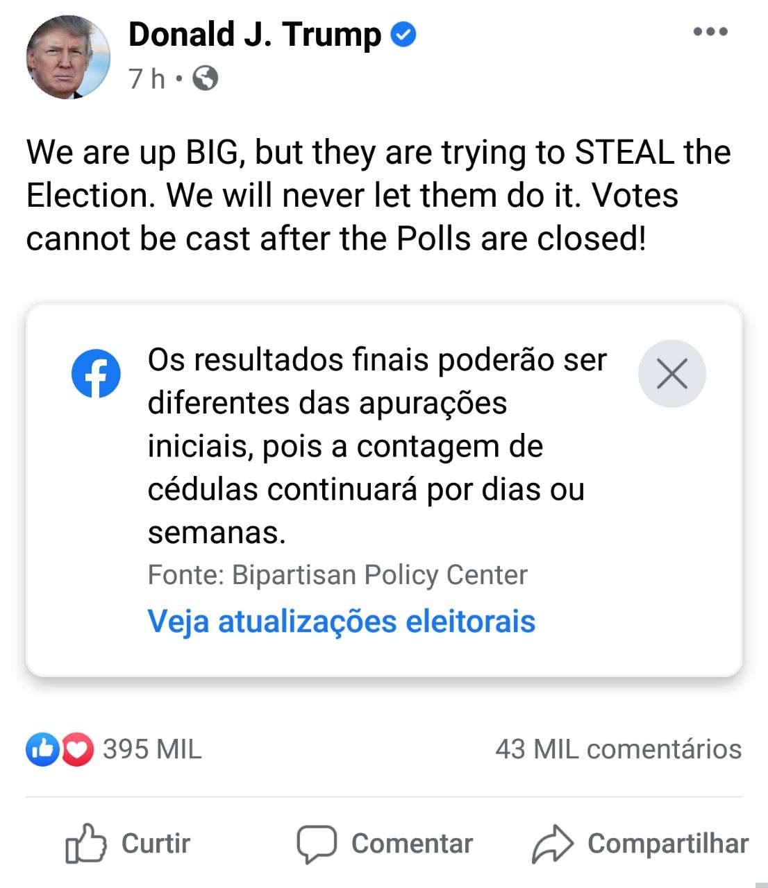 Já a resposta do Facebook é um pouco menos eficiente no sentido da distribuição do conteúdo e opta por deixar claro ao usuário o status atual da eleição. A publicação de Trump pode ser vista por toda a comunidade, mas logo abaixo a rede social informa que “Os resultados finais podem ser diferentes das apurações iniciais, pois a contagem de cédulas continuará por dias ou semanas”. A mesma notificação é repassada no Instagram e aconteceu para posts subsequentes do presidente – incluindo um no qual diz “Eu estarei fazendo um pronunciamento esta noite. Uma grande VITÓRIA”.