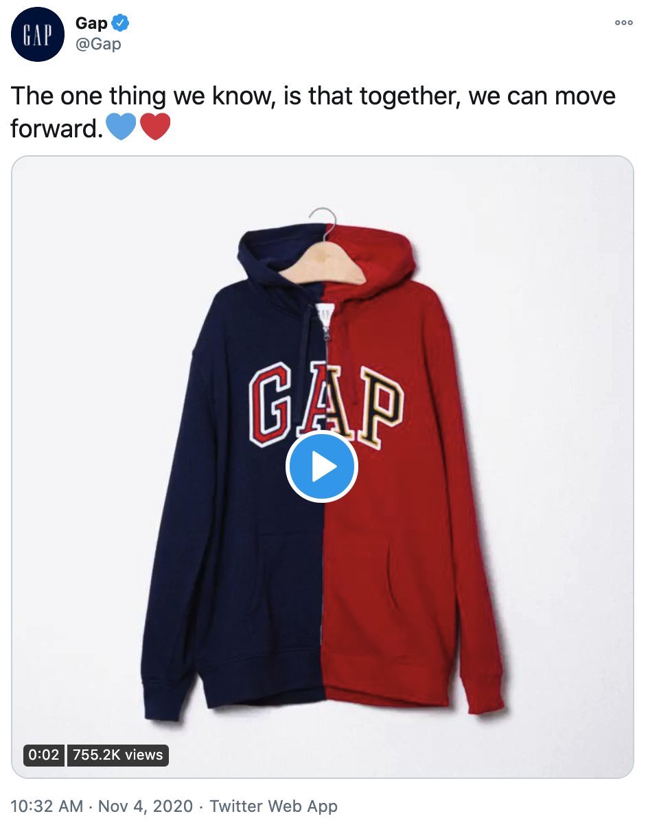A marca lançou no começo da última quarta-feira (4) uma publicação em seu perfil no Twitter onde revelava um agasalho pintado das cores azul e vermelha – as cores tradicionais dos partidos democrata e republicano, respectivamente – e clamava que o público norte-americano se mantivesse reunido durante e depois da eleição. “A única coisa que sabemos é que juntos podemos seguir em frente” escrevia o tuíte.