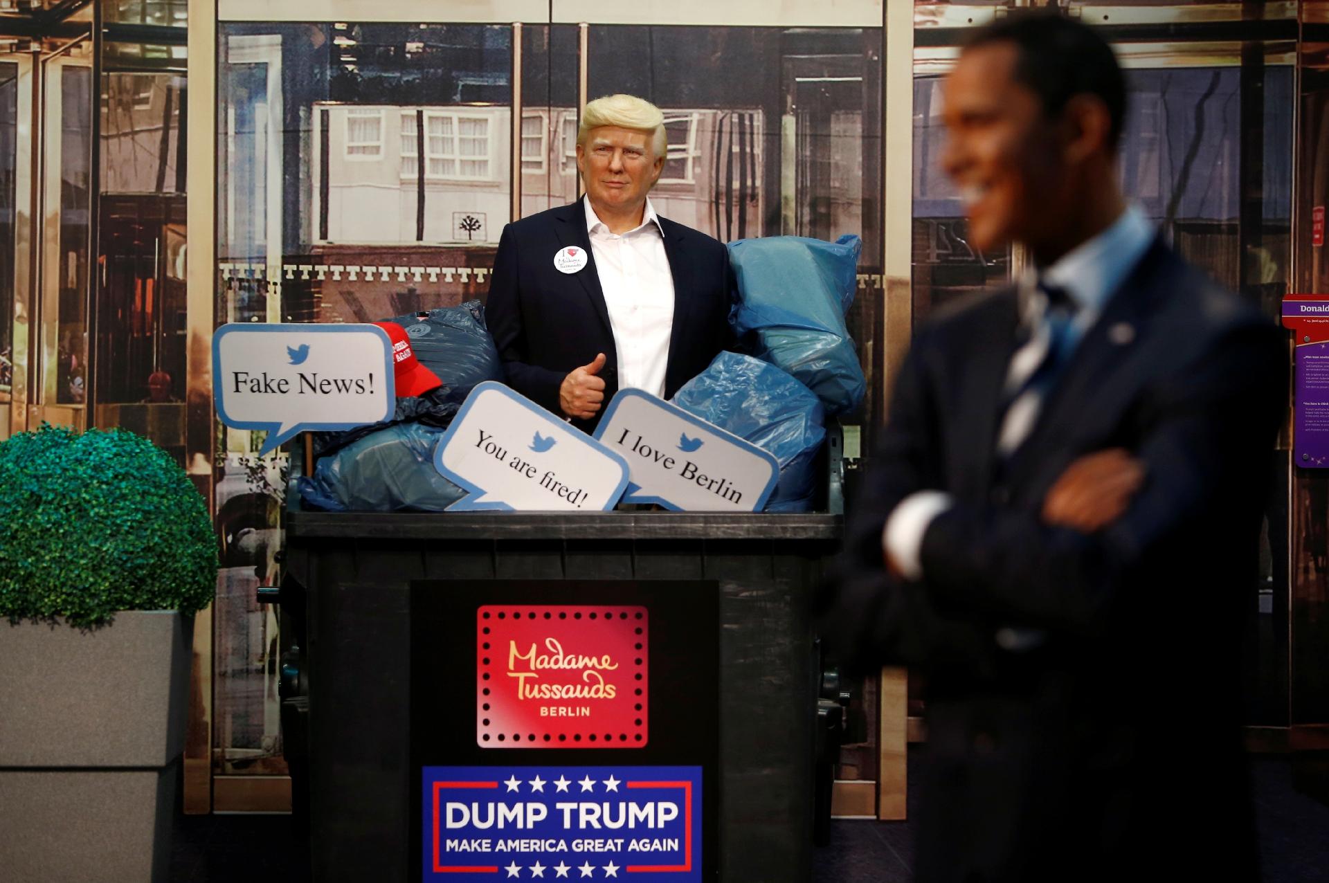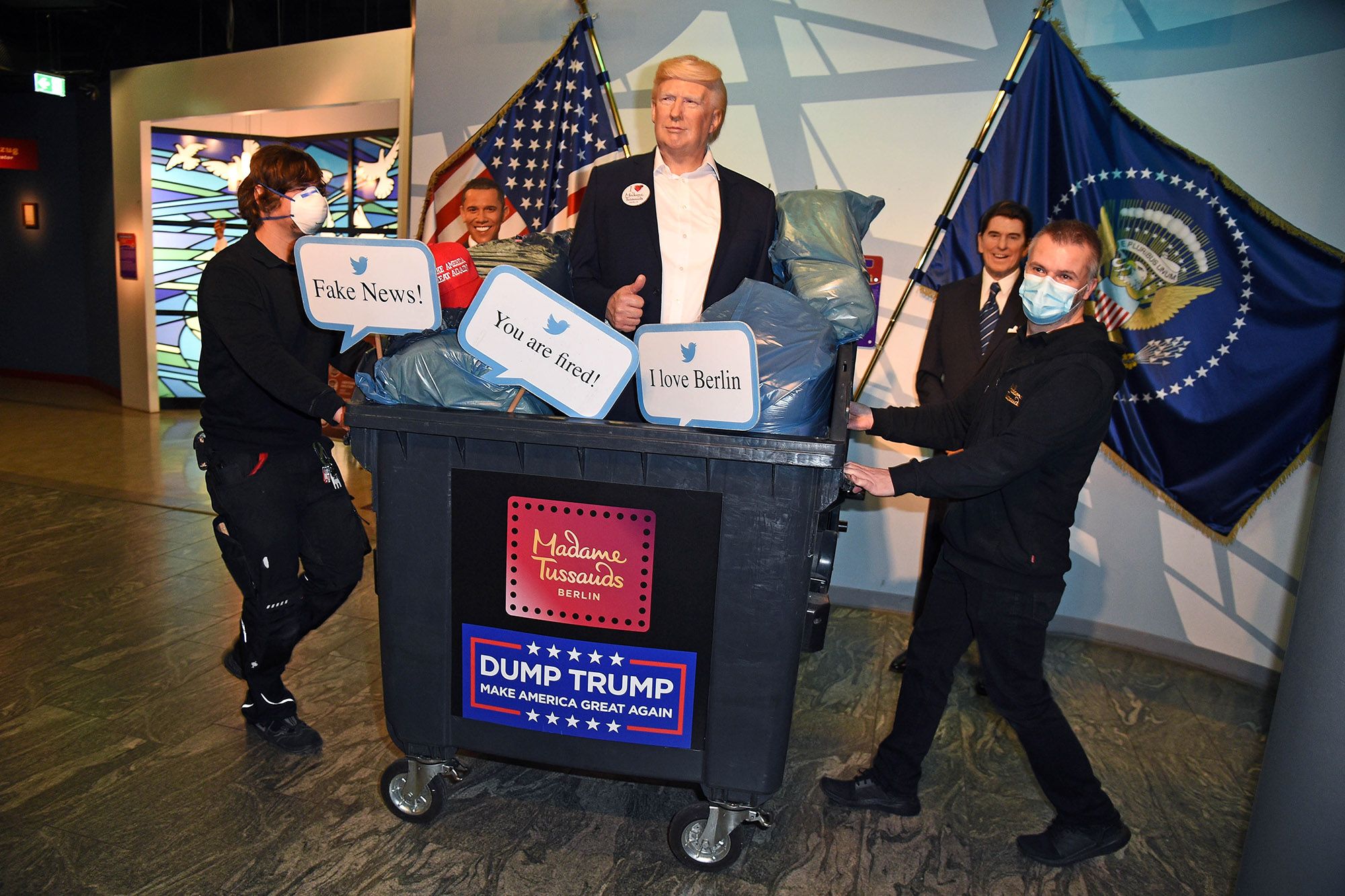 Já o museu da Alemanha colocou a estátua do atual presidente derrotado no lixo... literalmente