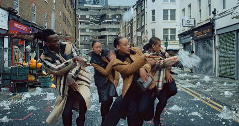 A campanha especial de fim de ano da Burberry traz uma versão moderna e diferenciada da clássica cena de Gene Kelly cantando e dançando pelas ruas no filme “Cantando na Chuva”, de 1952. O vídeo foi produzido pela RiffRaff Films, dirigido pelo coletivo MegaForce e com direção de criação de Riccardo Tisci. A cena do anúncio foi coreografada pelo grupo francês de dança (La) Horde.