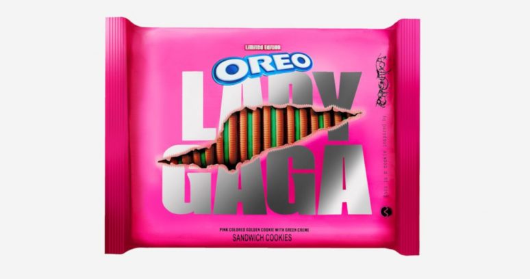 Lady Gaga e Oreo anunciaram uma parceria para lançar uma linha da bolacha inspirada no mais recente álbum da cantora, “Chromatica”. Em vez da tradicional bolacha preta com recheio branco, essa edição é rosa com recheio verde, e traz estampadas algumas imagens inspiradas no disco.