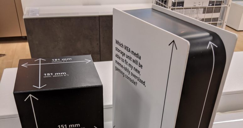 Quem percebeu este “efeito colateral” da nova geração foi a IKEA, que nos últimos disponibilizou réplicas de papelão dos dois videogames em algumas de suas unidades. A ação foi registrada por usuários do Reddit e é exatamente aquilo que se espera: versões similares dos consoles com as mesmas proporções para ajudar clientes na escolha de estantes e racks que melhor acomodem seus interesses gamers.