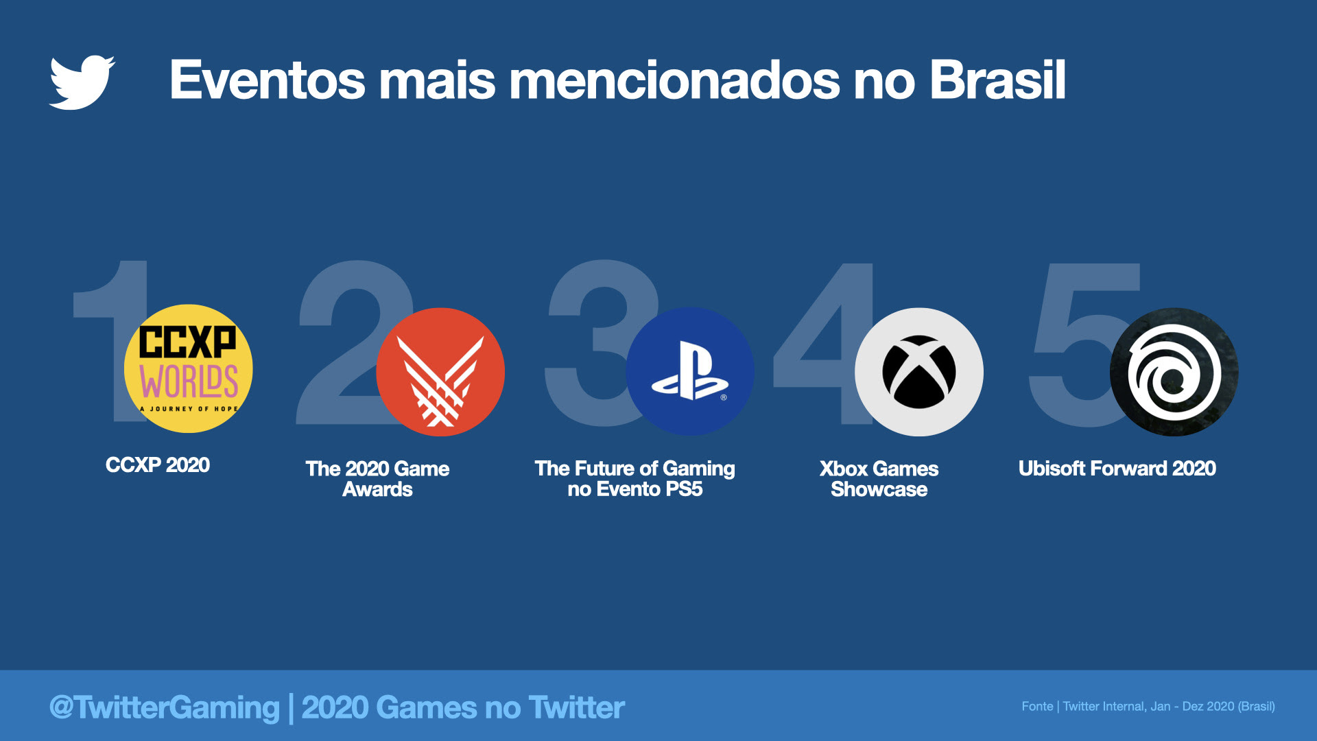 O Brasil segue sendo um dos países que mais fala sobre games, na quarta colocação. Japão, Estados Unidos e Coreia do Sul, respectivamente, formam o top 3. De acordo com levantamento da plataforma, a quantidade de tweets sobre o assunto dobrou por aqui em 2020 se comparado com o ano anterior.