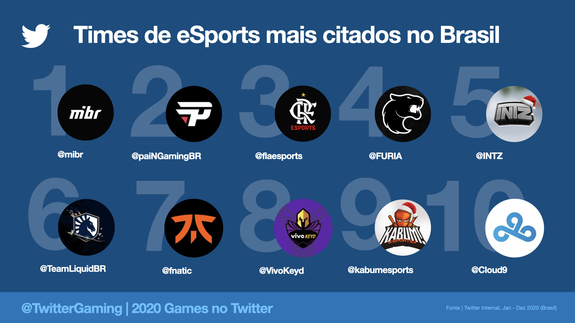 Os times de eSports brasileiros estão entre os 10 mais citados do mundo, com mibr em terceiro, paiN Gaming em quinto, Furia em oitavo e Flamengo Esports na nona colocação. Em sua retrospectiva, o Twitter apontou que no Brasil os jogos mais comentados na plataforma foram “League of Legends”, “Among Us” e “Minecraft”.