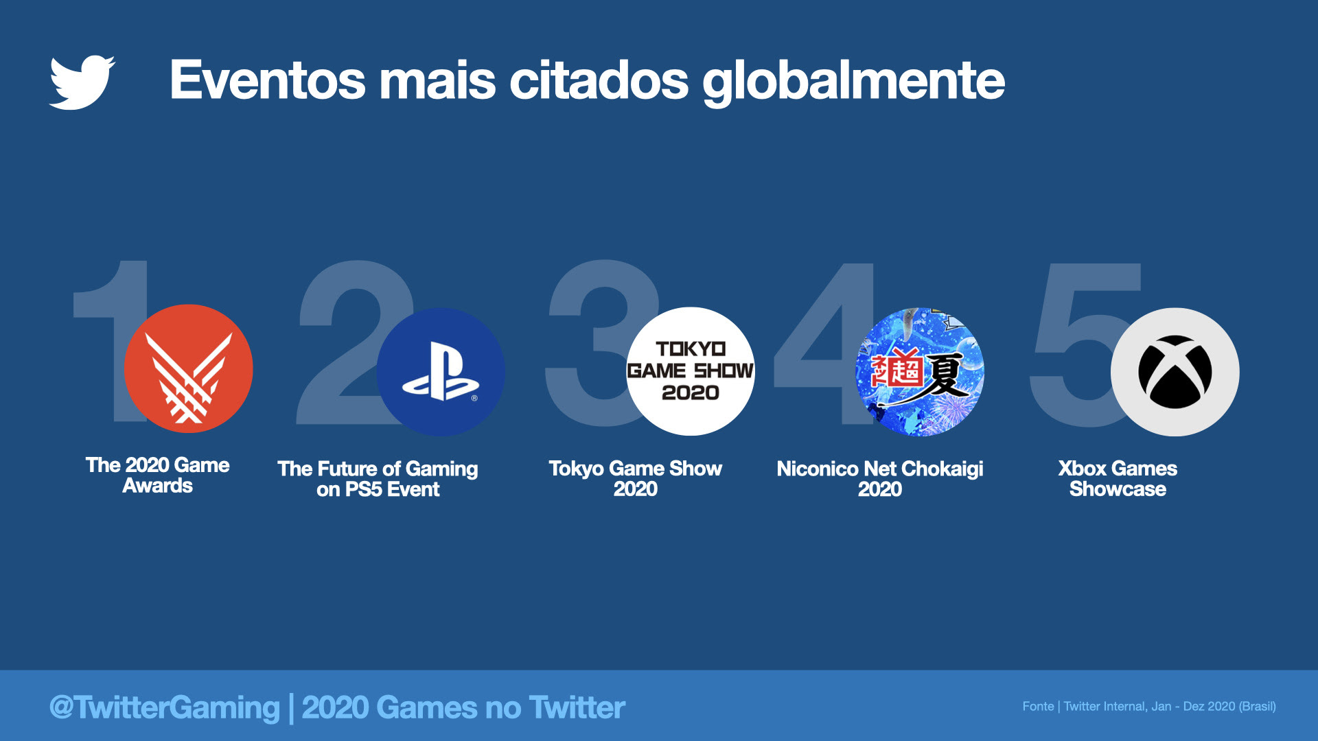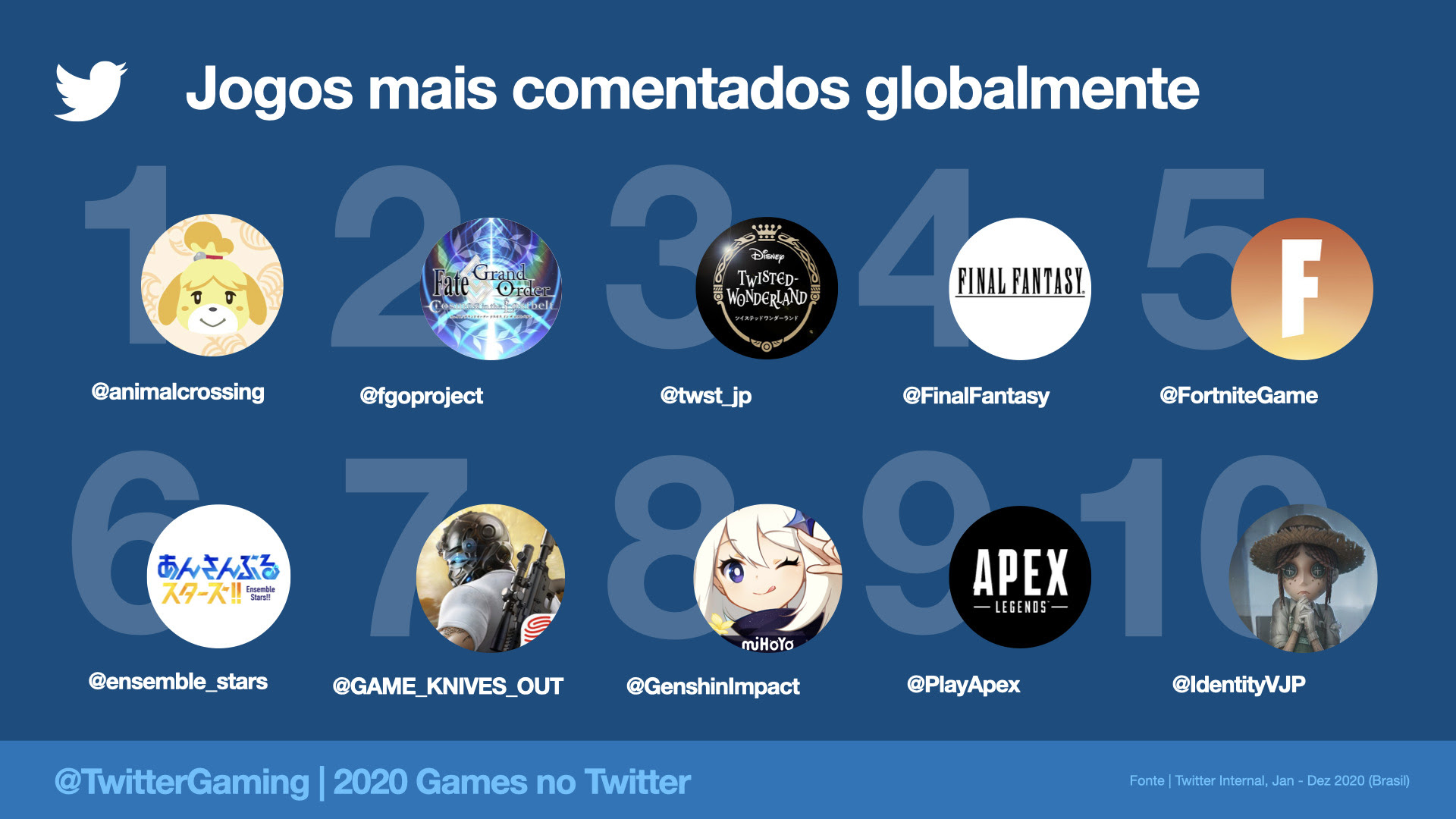 2020 foi o ano em que mais se falou sobre games no Twitter. Foram registrados mais de 2 bilhões de tweets sobre o assunto em todo o mundo. Este número representa um crescimento de 75% em relação a 2019, com aumento de quase 50% quando se trata de autores únicos. Para se ter uma ideia, o tema foi o sexto tópico mais comentado na plataforma ao longo do ano passado.