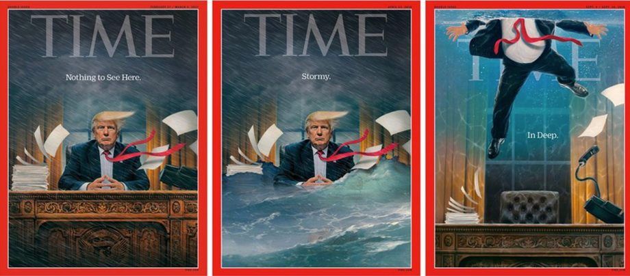 Sobre a capa, a ilustração é creditada a Tim O’Brien, artista que também foi responsável nos últimos anos por uma trilogia de capas envolvendo a “tormenta” de problemas e crimes de Trump no salão oval. Enquanto as artes da administração anterior deram conta de “literalizar” o desastre crescente do governo a partir de uma enchente no salão oval (veja abaixo), a arte da edição desta semana da revista resgata a imagem do caos em Washington e sobretudo da invasão ao Capitólio, mostrando pichações e papeladas desordenadas por todo o escritório do novo presidente.