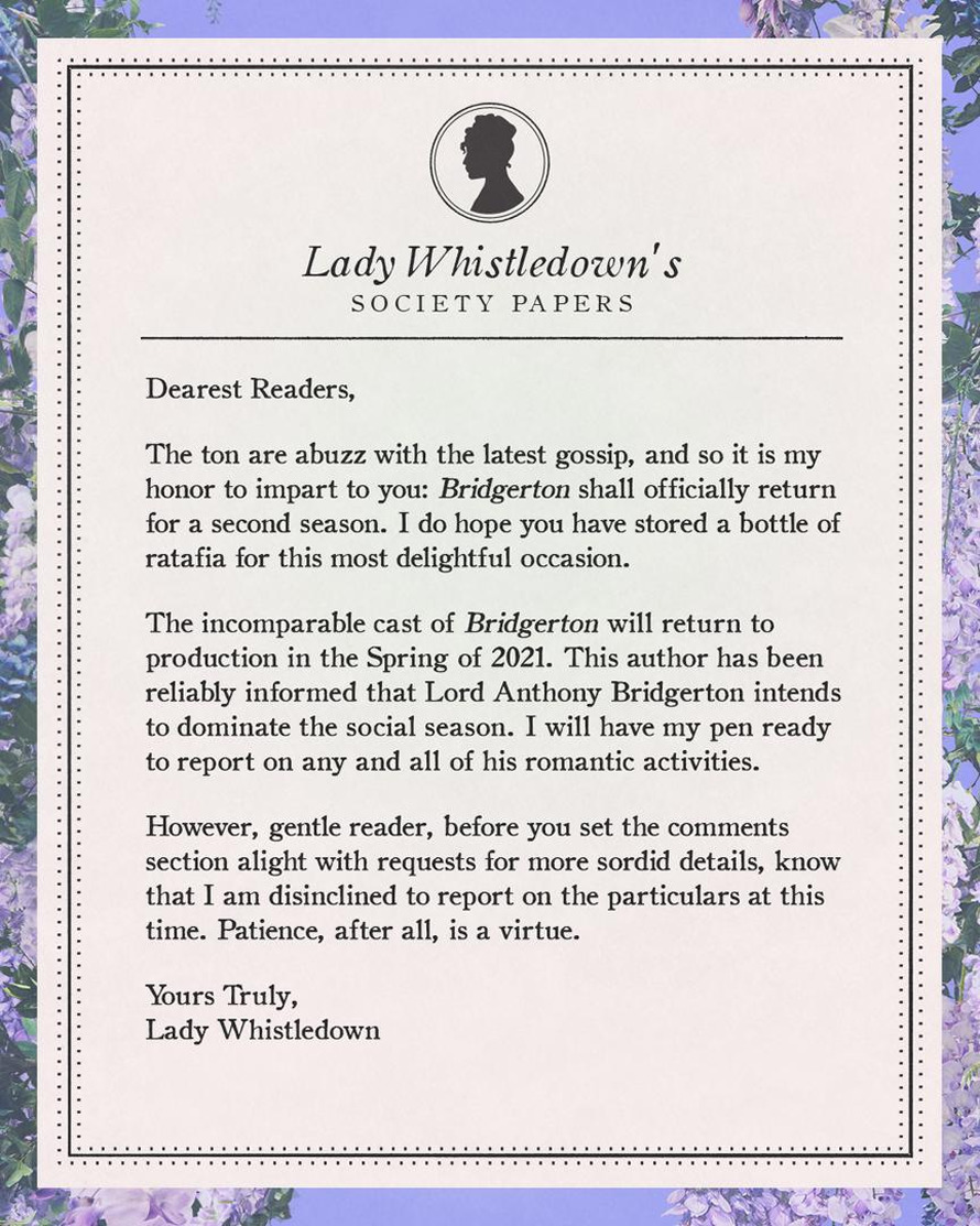 “A alta sociedade está alvoroçada com as últimas fofocas, e por isso tenho a honra de contar a vocês: Bridgerton oficialmente retornará para uma segunda temporada”, diz a carta.