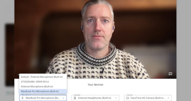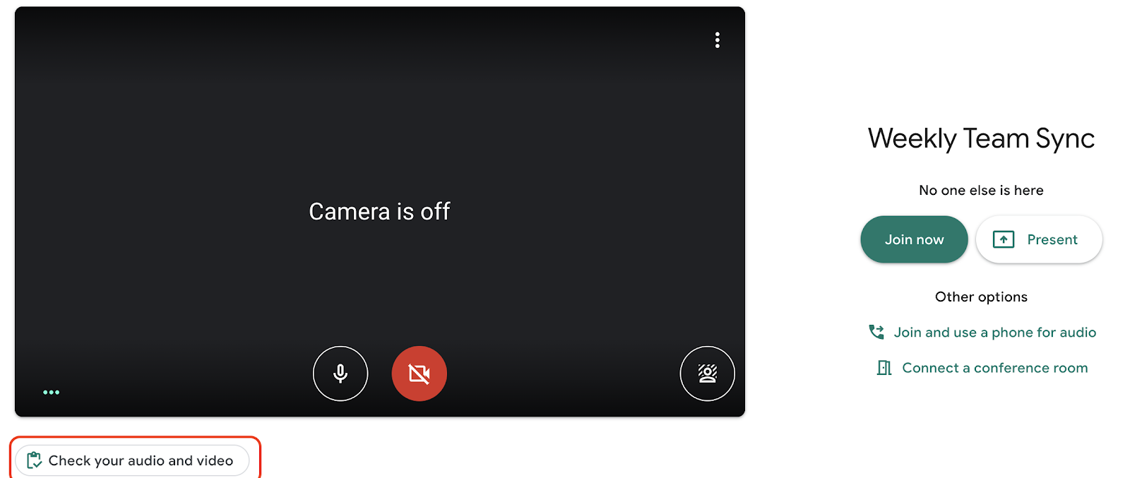 O botão “Verifique seu áudio e vídeo” aparece bem embaixo da tela inicial do Google Meet, antes que o usuário clique em entrar na reunião. Clicando na opção de verificação, uma janela pop-up abrirá mostrando uma imagem do seu vídeo e permitindo você veja (e altere) qual microfone, alto-falante e câmera estão ativos no momento.