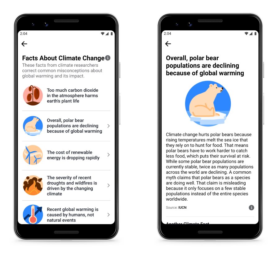 Para tanto, a central de informação dedicada ao clima também ganhou novidades. O Facebook afirma que adicionou uma nova seção na página que é dedicada ao esclarecimento de mitos em torno do aquecimento global, cujas respostas e textos foram escritos e revisados por especialistas da área das universidades de Cambridge e George Mason junto do Programa de Comunicação de Mudanças Climáticas da Universidade Yale.