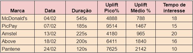 Na sequência, os destaques da análise apresentam Pantene, com aumento de 7625% e uplift de 2.142%; Above, com crescimento de 6.411% e uplift de 1840%; McDonald’s, com alta de 4.888% e uplift de 788%; e Amstel, ocupando a quinta posição com 4.180% e uplift de 965%.
