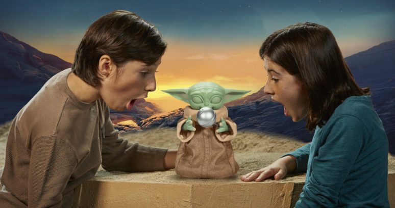 A Hasbro diz que o boneco “avisa quando ele gosta de algo. Ele também tem alguns poderes de força e pode levitar seu brinquedo favorito – bolinha prateada da nave do Mandaloriano.