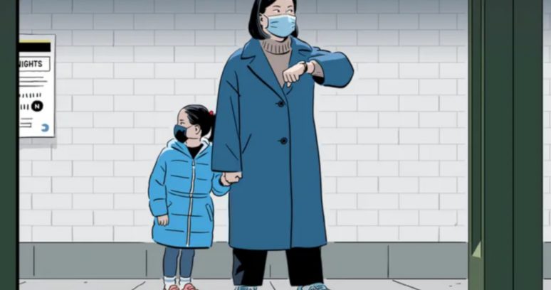 Intitulada “Delayed”, a ilustração do artista R. Kikuo Johnson mostra uma mulher asiática segurando a mão de sua filha enquanto esperam em uma plataforma de metrô. De forma simples, Johnson mostra a linguagem corporal sutilmente cautelosa e as expressões ansiosas das duas, representando o momento de ansiedade e atenção por estar em público.