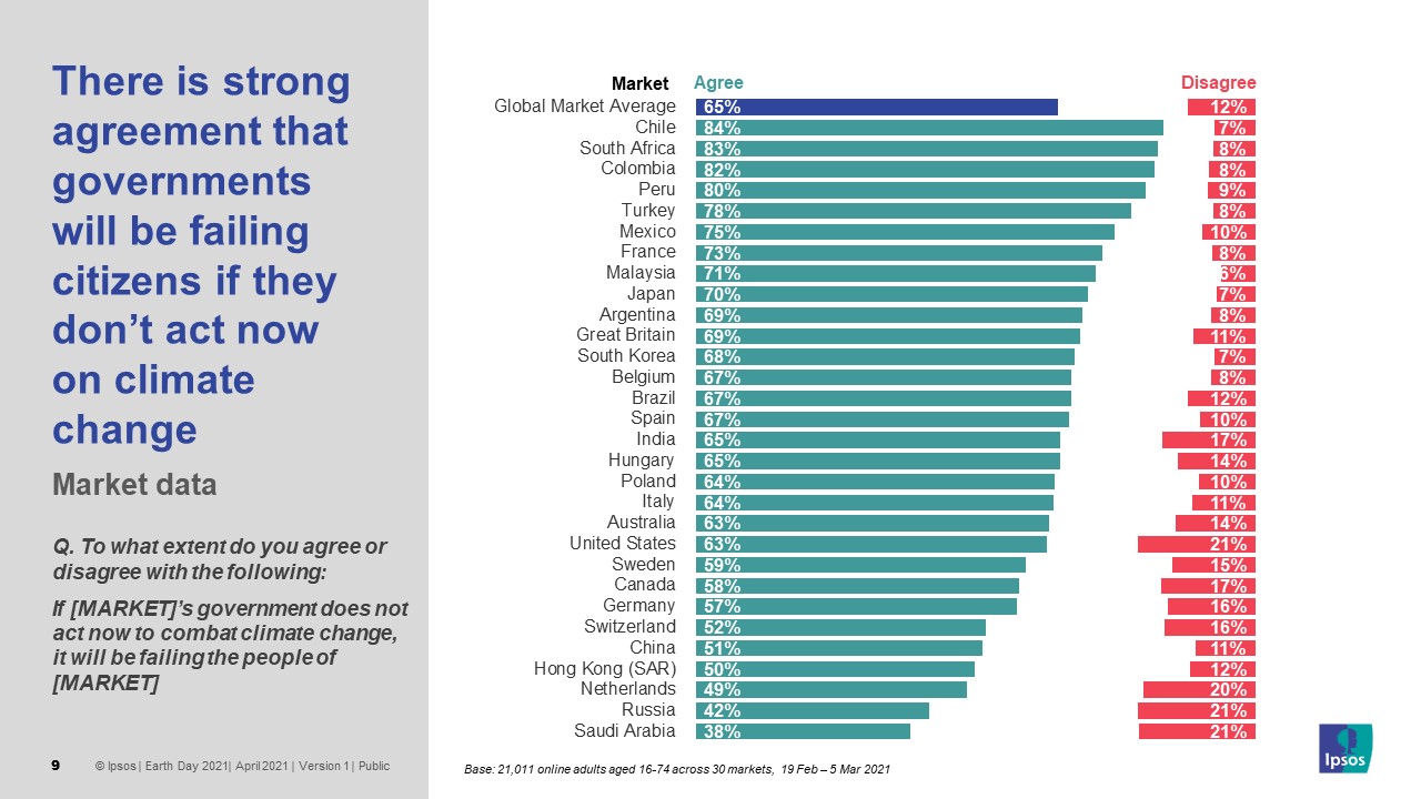 Quase sete entre cada dez brasileiros (67%) acreditam que, se o governo não agir agora para combater as mudanças climáticas, estará “deixando a desejar”. O dado faz parte do levantamento Earth Day 2021, realizado pela Ipsos com entrevistados de 30 nações por ocasião do Dia da Terra, celebrado em 22 de abril.
