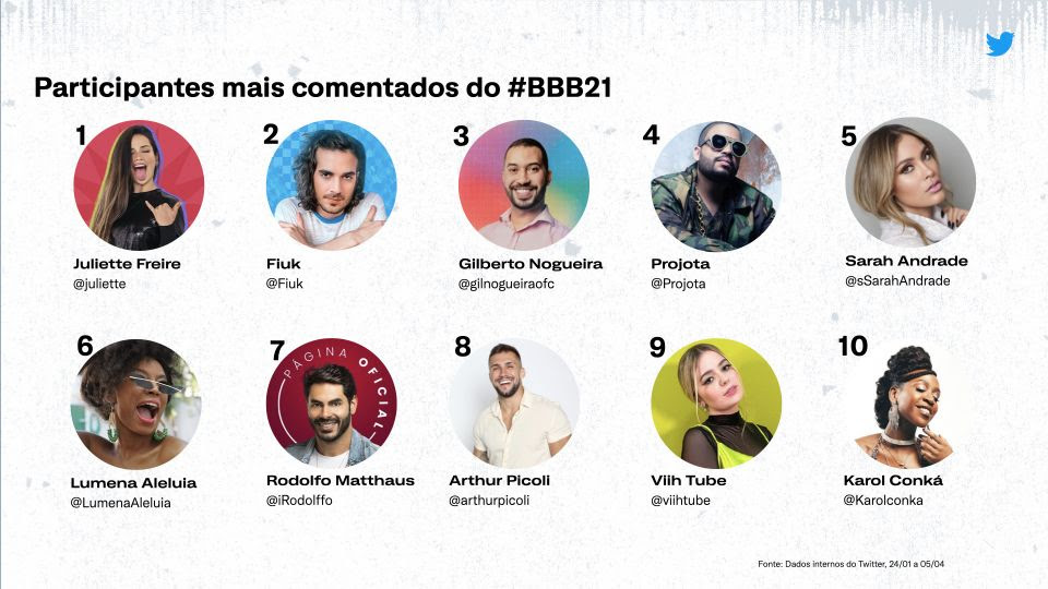 A primeira colocação entre os participantes mais comentados no Twitter ficou para a campeã Juliette, seguida por Fiuk e Gil do Vigor. Confira abaixo a lista dos dez participantes mais comentados do #BBB21 no Twitter globalmente.