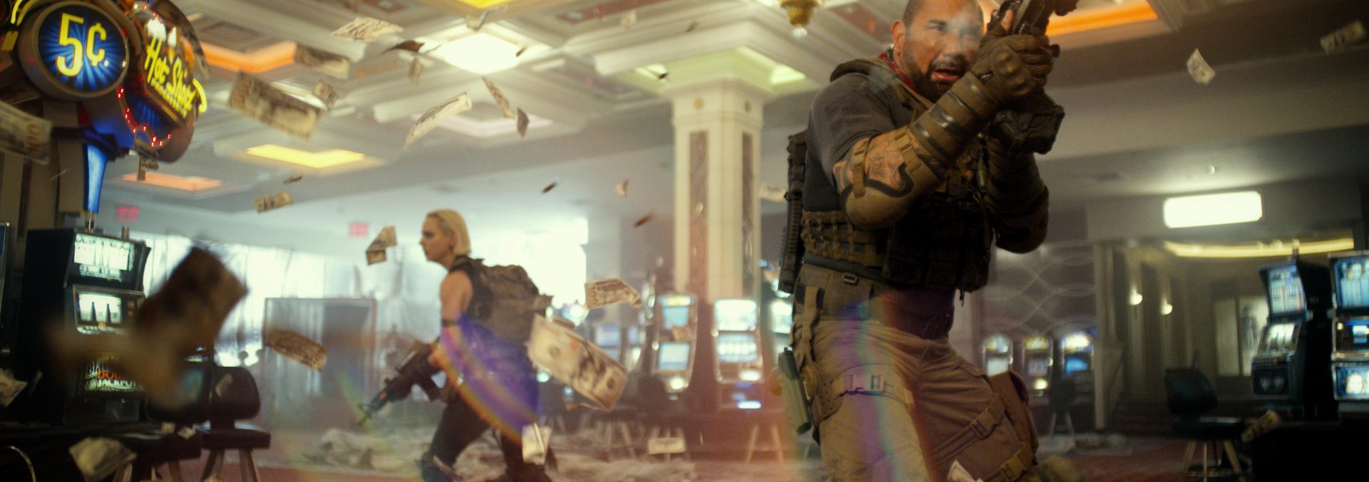 É exatamente este contraste que chama a atenção no filme, até porque ele pode ser muito drástico devido ao caráter da história. Snyder de certa forma refaz aqui e a seu jeito o caminho de filmes como “Fuga de Nova York” e “Tragam-me a Cabeça de Alfredo Garcia”, evocando o desejo destas obras de trazer à tona a banalidade dos sacrifícios envolvidos em ordem de expiar a crueldade da hierarquia envolvida. O assalto da vez é menos uma saída do sistema que um trabalho a ser cumprido, afinal, conforme o grupo de mercenários reunidos pelo protagonista Scott Ward (Dave Bautista) está a serviço de um bilionário qualquer (Hiroyuki Sanada).