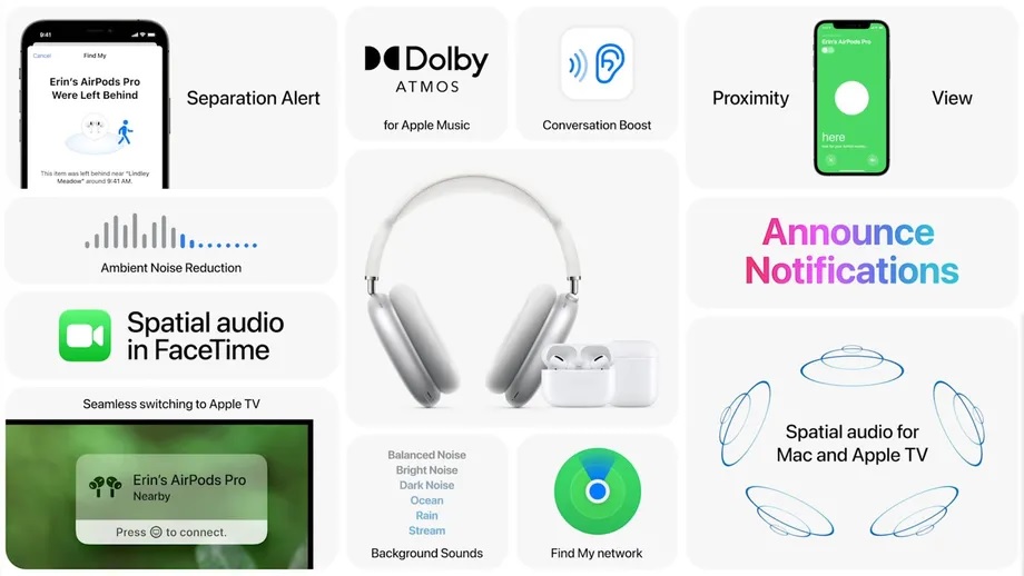 Por fim, no campo geral do áudio, a Apple divulgou a introdução da opção de reprodução de músicas em Dolby Atmos para o Apple Music e da introdução do áudio espacial para o FaceTime, o Mac e a Apple TV.