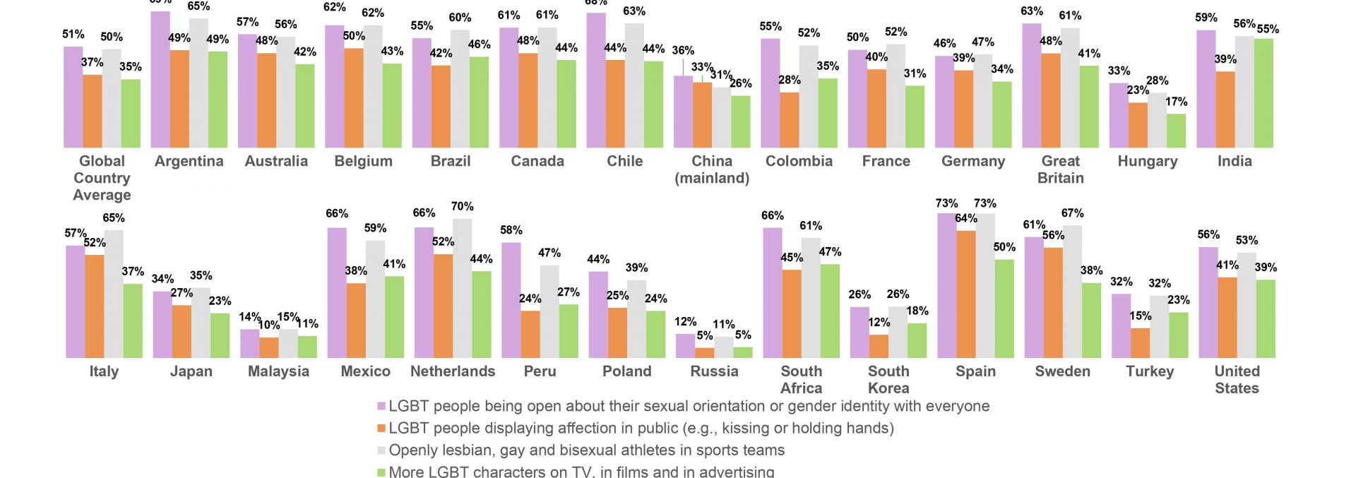 A pesquisa da Ipsos expôs algumas opiniões contraditórias de brasileiros no que diz respeito à comunidade LGBTQIA+. Apesar de 55% dos entrevistados no Brasil opinarem que pessoas LGBTQIA+ devem ser abertas com todos sobre sua orientação sexual ou identidade de gênero, apenas 42% apoiam que esses casais demonstrem afeto em público, como dar as mãos ou um beijo.