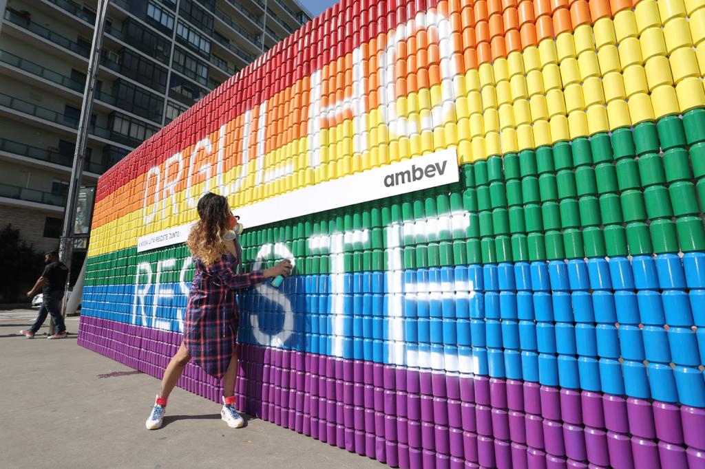 Como parte das ações do movimento #OrgulhoResiste, lançado pela Ambev no Mês do Orgulho LGBTQIA+, a empresa coloriu pontos emblemáticos de São Paulo neste final de semana. Um mural móvel, produzido com 3 mil latas de alumínio e pintado com as cores da bandeira que representam a comunidade, passou pela Praça do Ciclista, região da Avenida Paulista, e nas Praças Roosevelt e Ramos Azevedo, ambas na região central da capital paulista.