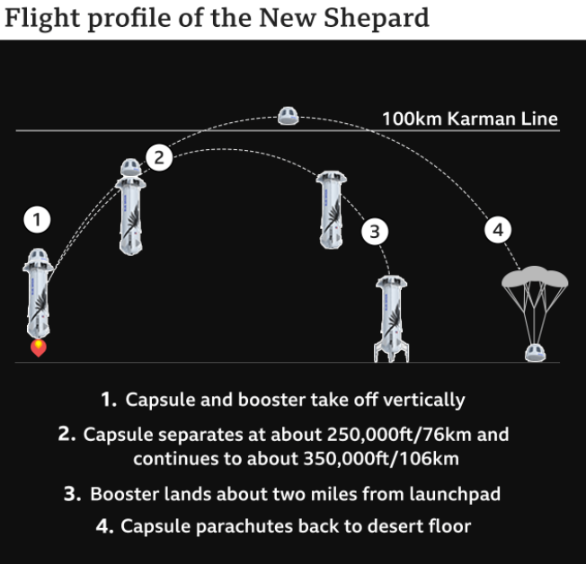 Como anunciado anteriormente, a New Shepard ultrapassou a chamada Linha de Karman, limite que fica a uma altitude de 100km acima do nível do mar e é usado para delimitar a divisão entre a atmosfera terrestre e o espaço. O voo saiu de um deserto do Texas às 10h12 (horário de Brasília), e voltou em segurança para a mesma região do deserto dez minutos depois, pousando às 10h22. E assim os tripulantes puderam ver a curvatura da Terra na borda da atmosfera.