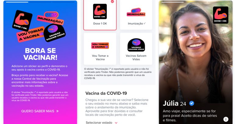 A central é fruto também do alinhamento da plataforma com os governos estaduais e o Unidos Pela Vacina, movimento civil que busca imunizar a totalidade da população brasileira até setembro deste ano – não à toa, o recurso tem escopo nacional para justamente ajudar nessa meta. Na divulgação, o diretor nacional do Tinder no país, Rodrigo Fontes, escreve que “Trazer informação sobre a eficácia das vacinas é essencial para voltarmos a conviver socialmente de forma segura” e comenta que o aplicativo “tem o orgulho de apoiar essa iniciativa tão importante”. “Nossa esperança é que os stickers tornem mais fácil e divertido para todos compartilharem seu status de vacinação no perfil, além de uma maneira de apoiar os nossos membros a continuar buscando conexões no app” finaliza o executivo.