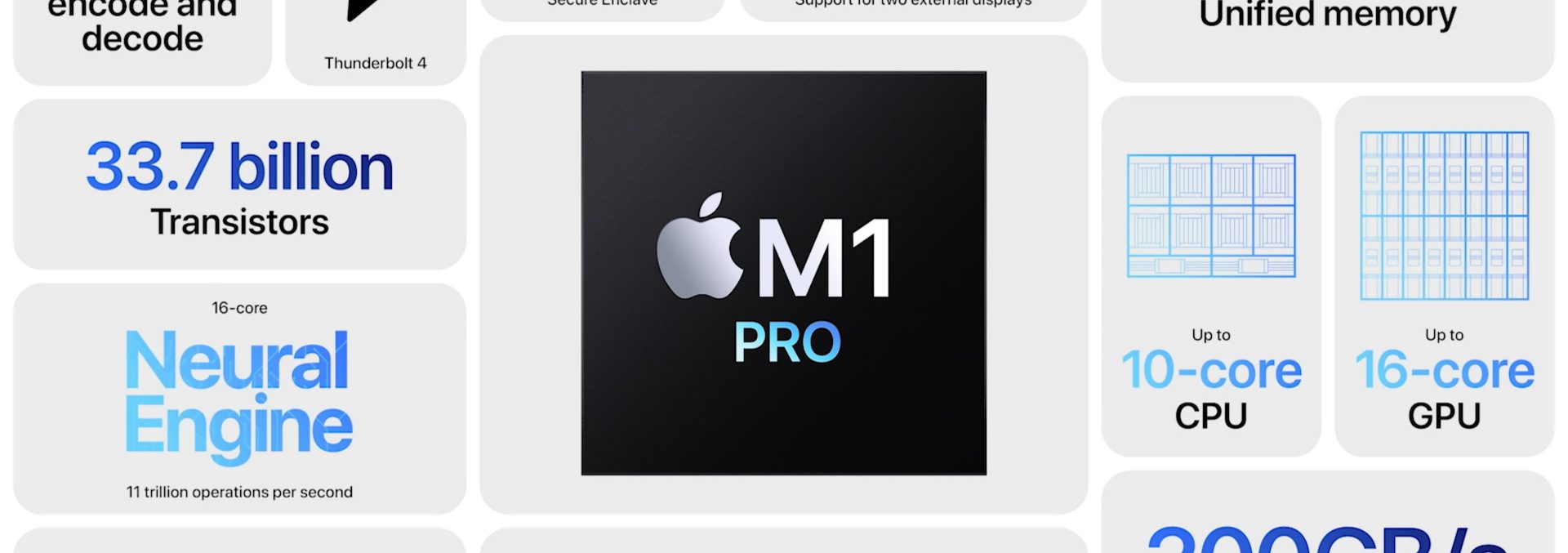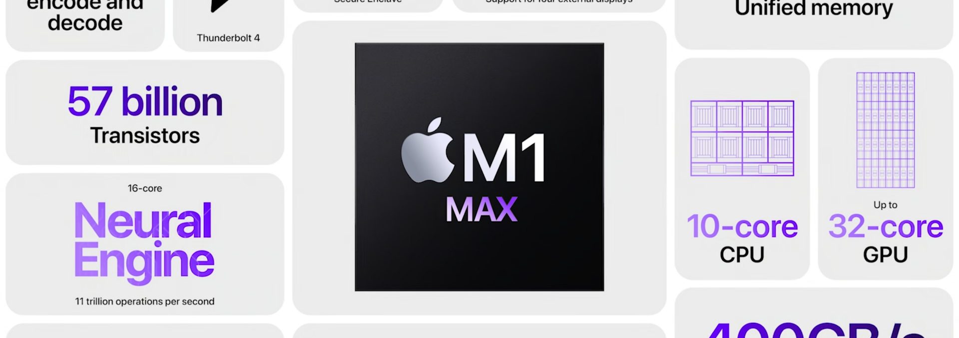 A Apple aproveitou o lançamento de uma nova linha de MacBooks Pro para também inaugurar dois novos chips produzidos internamente, o M1 Pro e o M1 Max. Na prática é tudo sobre velocidade: enquanto o Pro processa até 200 gigabytes por segundo, conta 33,7 bilhões de transistores e 8 cores de alto processamento, o Max processa 400 gigabytes por segundo, possui 57 bilhões de transistores e leva 32 cores de alto processamento.