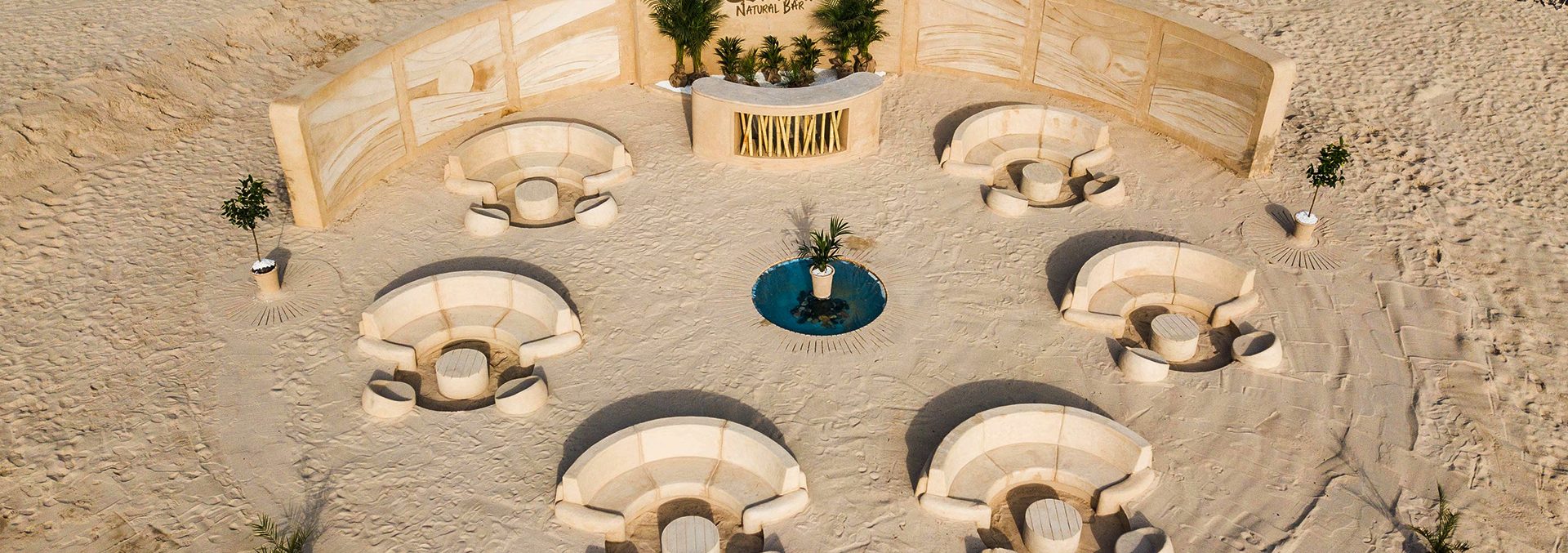 Pensado para oferecer momentos de conexão entre as pessoas e a natureza de maneira sustentável e integrado ao ambiente natural, o espaço foi feito à mão e não leva qualquer tipo de metal, plástico ou concreto na construção. Materiais como bambu, argila e madeira foram utilizados para complementar as estruturas de areia, que formam um bar e oito mesas, cada qual capaz de acomodar até seis pessoas. A criação é da Haute com a Guru360.