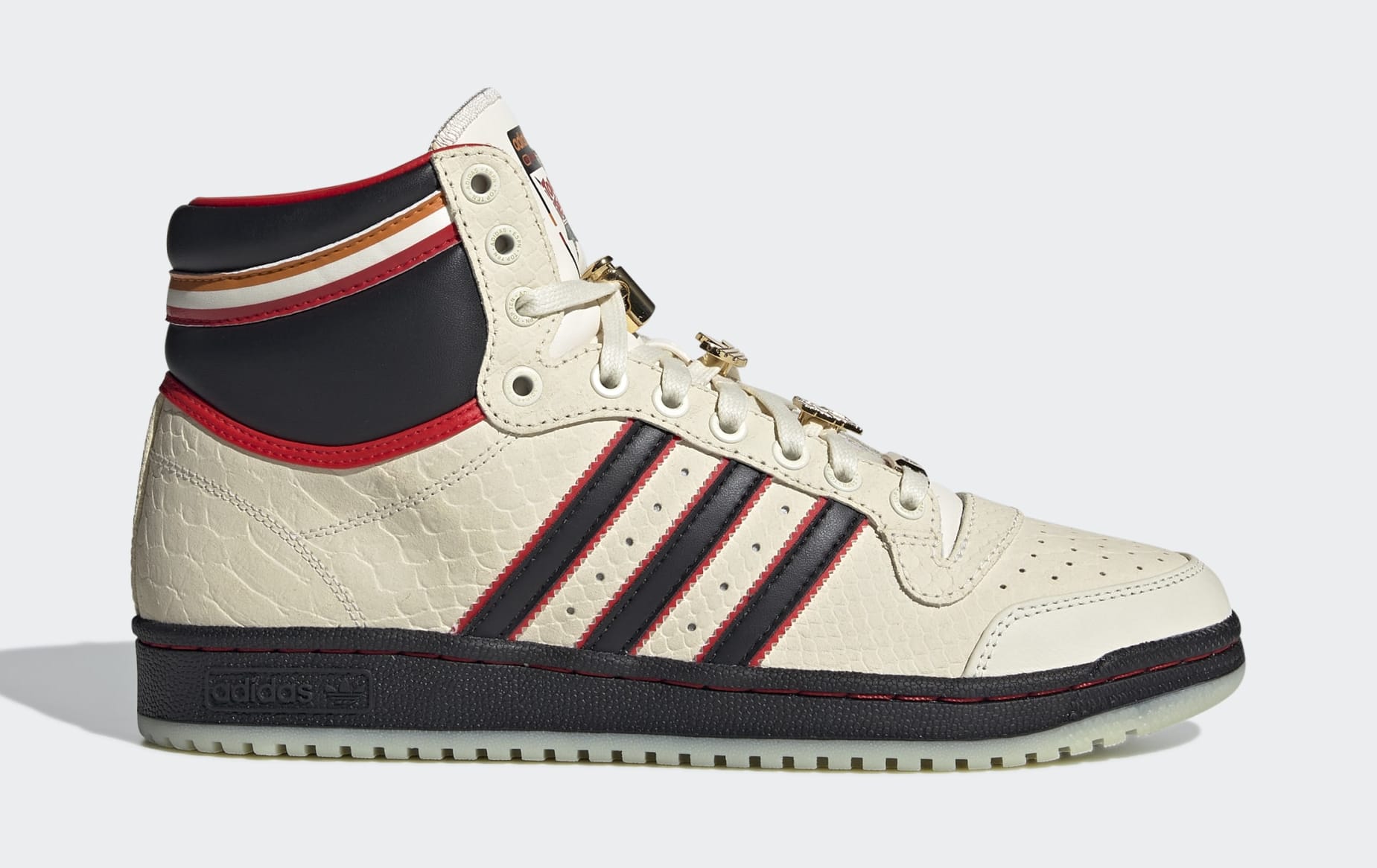 Mantendo o design aerodinâmico e o cano longo característico dos tempos de Rick Barry e Kareem Abdul-Jabbar, o Top Ten Hi ESPN também traz materiais inusitados, como couro premium que imita pele de cobra e pingentes dourados que dão um toque moderno ao tênis. No calcanhar vemos o logo da ESPN, enquanto a língua exibe um logotipo especial Adidas x ESPN SportCenter “Top Ten”.